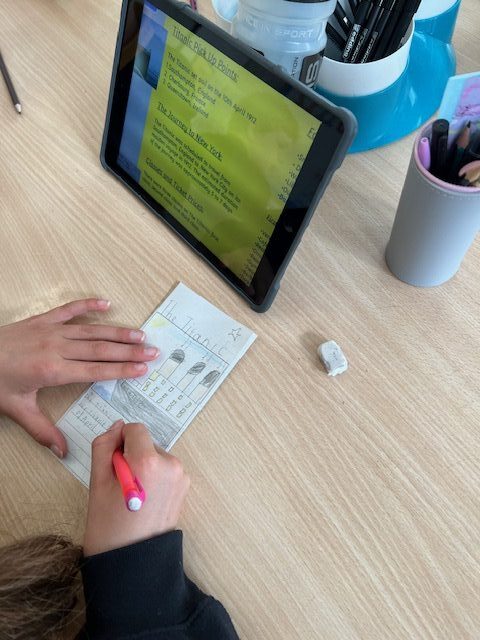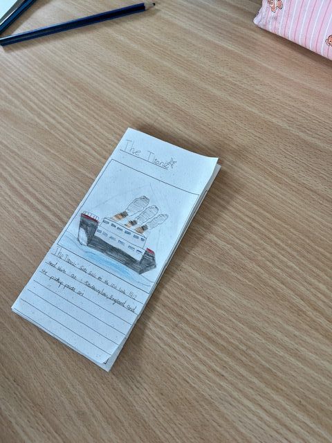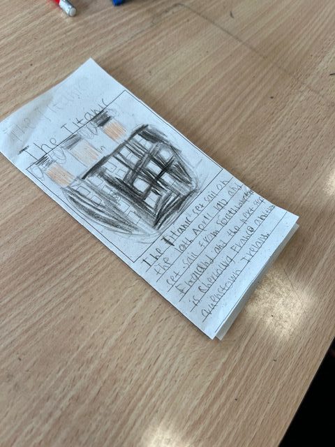 P5/6 have been using their knowledge of the Titanic to create a brochure advertising the ships maiden voyage. Each brochure included relevant facts explaining the different pick up points, facilities onboard the ship, and ticket prices.