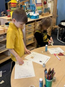 in the photo above, some children are completing ‘I spy’ SATPIN. Another task was cut and stick of 3 letter words and matching the picture to them eg. Map, pat.