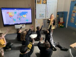 Today we introduced our new topic “Around the World”.  We played a game of pin the dot on the country to help us decide what countries we are going to learn about. The children discussed some of the things they would like to learn about certain countries too.