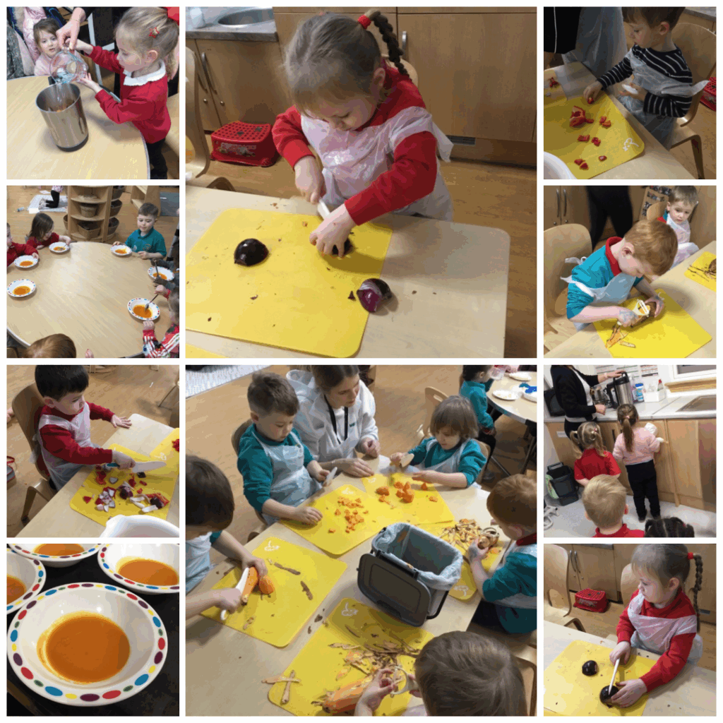 ‘Chop, chop, chop in a happy group, nursery friends make vegetable soup’