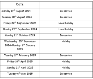 Please find attached below the dates the centre will be closed in 2024-2025.