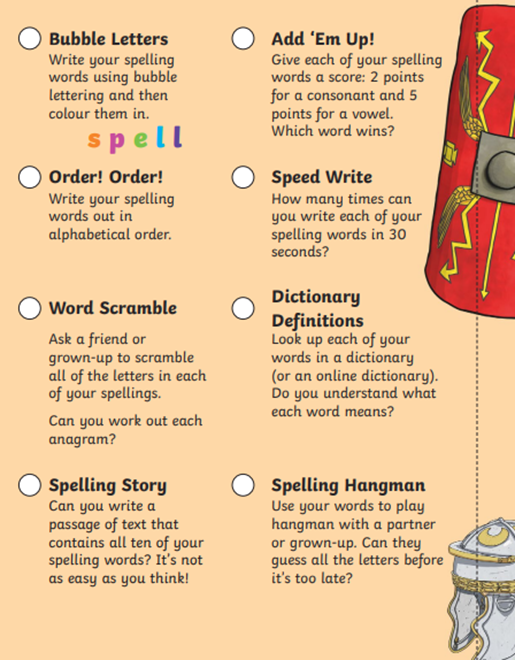 The spelling menu is in the jotter – Please choose an option to help your child learn their spelling words.