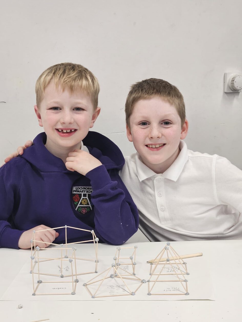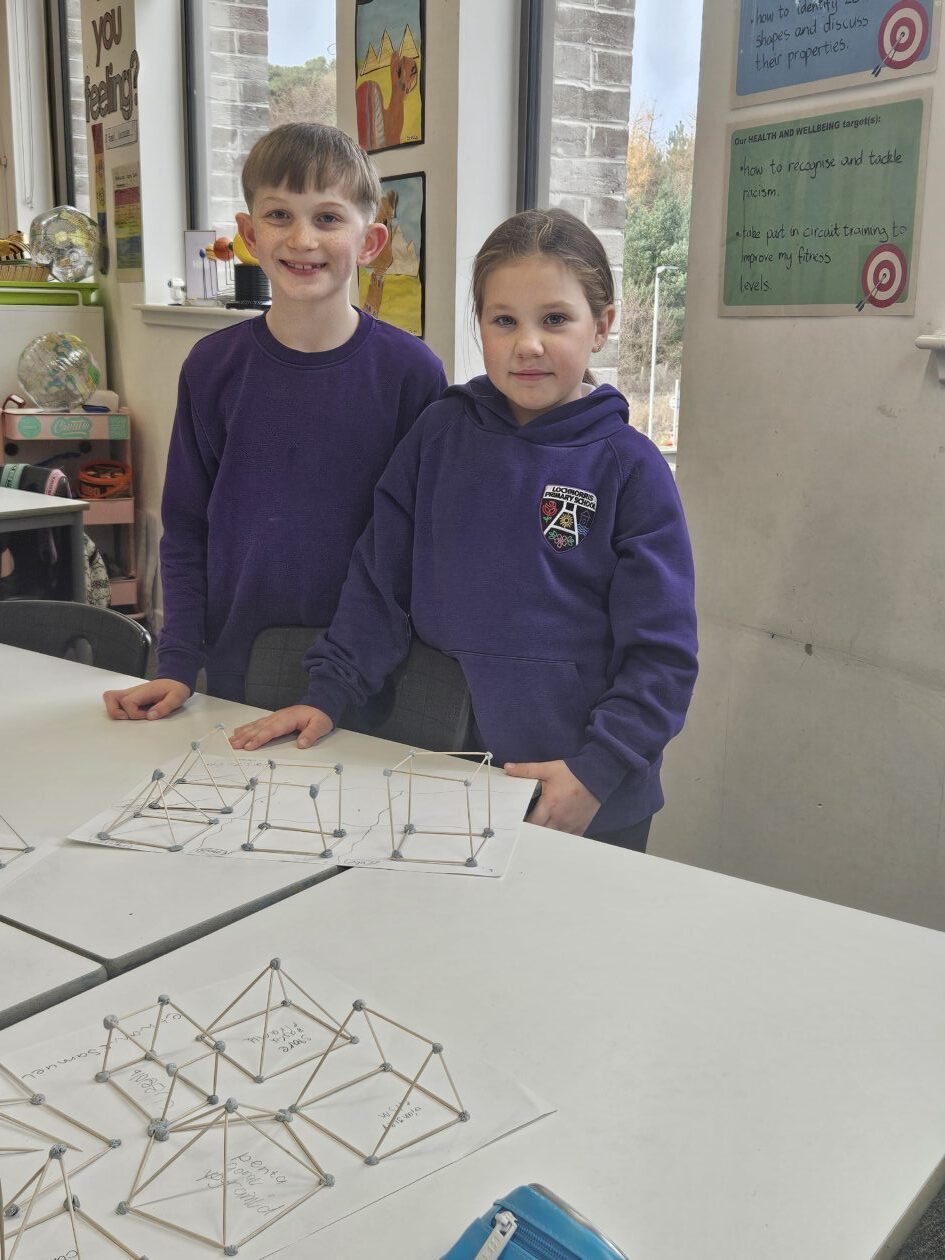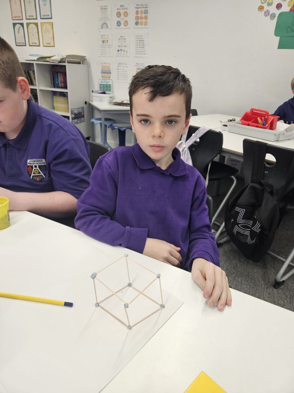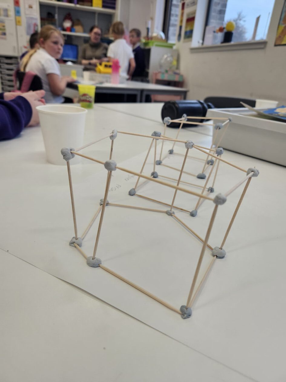 P4/5 have been learning about the properties of 3D shapes. We built skeleton models of some 3D shapes to show the edges and vertices. We used toothpicks as the edges and blue tac as the vertices. Have a look at our fantastic models!