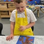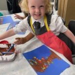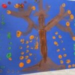 The children colour mixed to make brown for the trunk and branches of their trees then used autumn colours to finger print the falling leaves