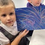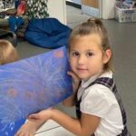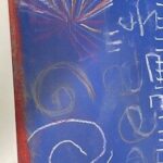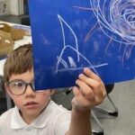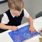 The children were learning all about fireworks and firework safety. They wrote descriptive words about fireworks as they watched videos of them. They played firework themed games and made music. They also used pastels to create firework patterns on the dark blue night sky-