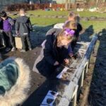 We fed the chickens, ducks, geese and turkeys. Then we met the horse , the claves and the sheep. We loved the pigs and we milked the pretend cow. We played games too and listened well to Dumfries House teachers- Heather and Claire.