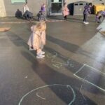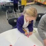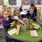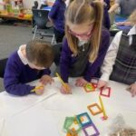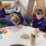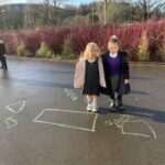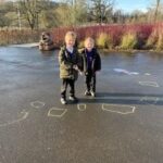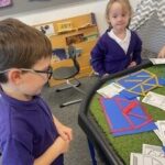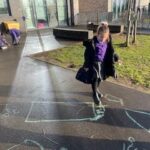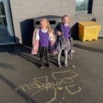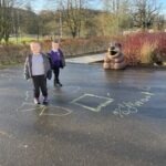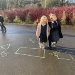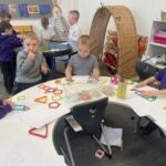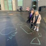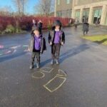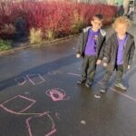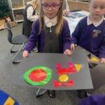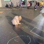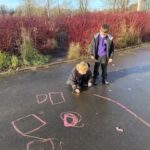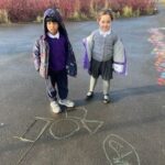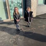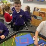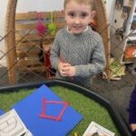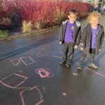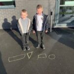 As part of outdoor learning this week, we have been revisiting the names and properties of 2D shapes. We came outdoors to do a 2D shape hunt together. We talked about some of the shapes we saw in our outdoor classroom and school playground, Then the children tried drawing the 2D shapes they had found using chalk on our damp playground. This practical play allowed for lots of talk about shapes,  their sides and their corners. Next week we will move on to investigate 3D shapes too!