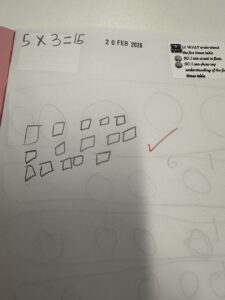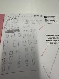 This term we are learning about multiplying and dividing.   So far we have learned about making equal groups, adding equal groups and now we are learning the X sign.  Last week we all were enjoying learning about multiplying using the X sign and connecting all our learning so far.  We have learned about ‘lots of’, multiplied by and now X.  We have been using pictorial representations to help us learn and concrete materials.  Here are some photographs of our learning.