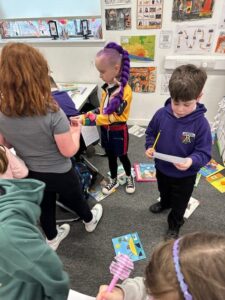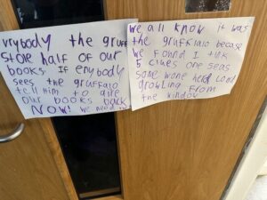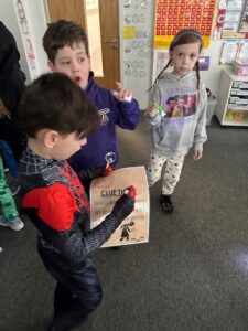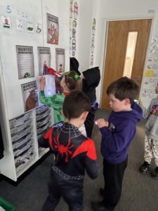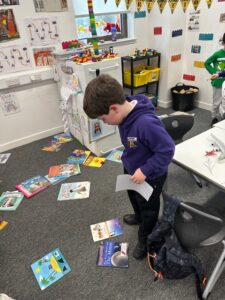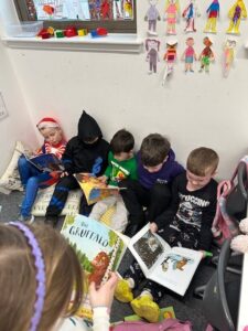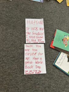On World Book Day we had lots of fun looking for clues to work out which character stole all our books.  We all made wanted posters to share the information with others.  We got a letter back from the Gruffalo and he returned all our books but made a mess.  We went on a book Scavenger Hunt and where we had to find a book that had a different characters or settings.  We had lots of fun.