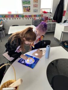 In primary 2/3 we have been exploring different feelings in our health and wellbeing.  We listened to a story about anxiety and talked about times we may feel anxious.  We linked this to our art and design and looked at the painting, “The Scream” by Edvard Munch.  We enjoyed creating our own background focusing on the lines and waves of the artist technique.   We also enjoyed taking a photo of our own anxious face to complete our artwork.  We are very proud of our artwork and decided to display it outside our class.