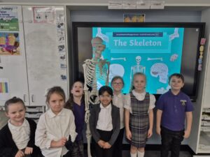 Today we began our IDL learning focus on ‘The Human Body’, continuing our ‘Health’ topic theme. We explored the human skeleton and labelled the different bones in the body. Our class was visited by a LIFESIZE skeleton and we enjoyed this opportunity to physically label key parts.