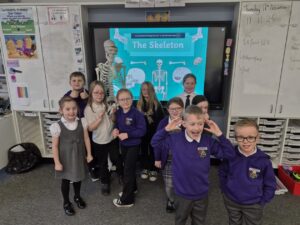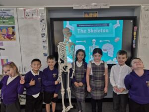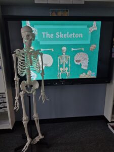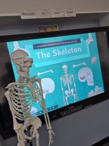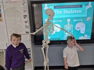 Today we began our IDL learning focus on ‘The Human Body’, continuing our ‘Health’ topic theme. We explored the human skeleton and labelled the different bones in the body. Our class was visited by a LIFESIZE skeleton and we enjoyed this opportunity to physically label key parts.