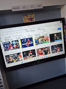Today we celebrated Scotland’s recent success by creating posters that said ‘We’re off to the World Cup’! We then danced to ‘Yes sir, I can boogie’ before singing Flower of Scotland too.