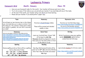 Please see below for the January Home Learning Grid. I have also attached our Scots Poem to learn. Have a go at some of these activities.
