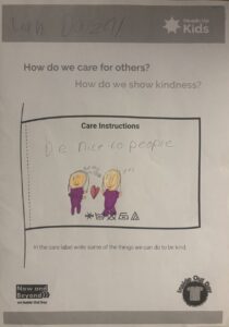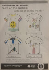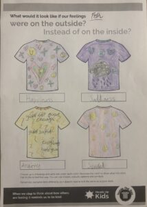 Our final tasks for this first session were to create t-shirts to show what our emotions would look like if they were on the outside and to write ‘care instructions’ for everyone to be kind.