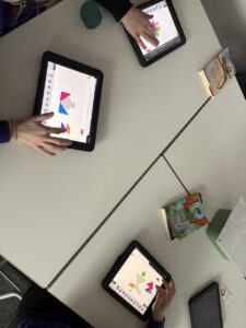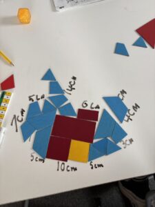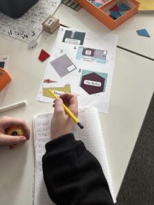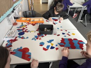 Maths stations: solving tangram puzzles, tessellating, completing symmetrical designs, drawing 2D shapes & discussing the properties of 3D shapes.