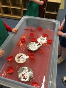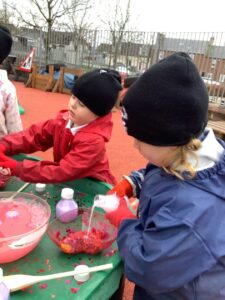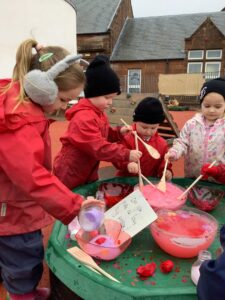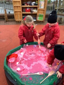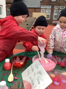Outdoors this week the children created a valentines sensory tray – making a love bug potion, pouring and filling, mixing new colours, sharing and turn taking with their peers during sensory exploration.