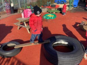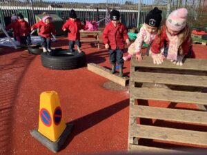 In the construction area the children were making their own obstacle courses, it initially began with a few children in a small area before it extended throughout ECC garden, using lots of various parts of the garden for their obstacle course. Lots of children enjoyed and engaged well, developing their gross motor skills.