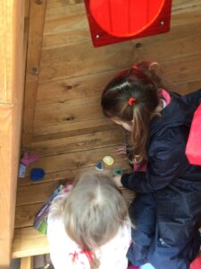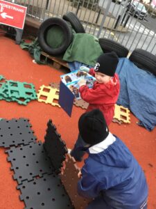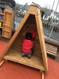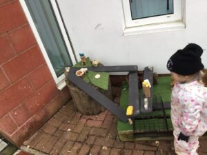 Outdoors this week the children have been working alongside Becca to revamp the outdoor area. The children have made clear defined areas outdoors, we have a new cosy shelter for children to explore in and some children have enjoyed a story in our cosy shelter. Some children enjoyed exploring with the small loose part materials in the small world area, using their imagination throughout.