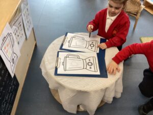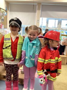 This week the children have been exploring People Who Help Us, exploring the different job roles and how their role might help us. They have enjoyed using their imaginative skills in the role play area, taking on the role of e.g. a doctor, police officer, fire fighter, applying their real life experiences to their imaginative play. All children have knowledge of People Who Help Us however, we explored the children’s learning in more depth with a focus on doctors and hospitals. Some children were able to identify body parts and the name for specific body parts, some children were exploring x-ray photographs on the light box.