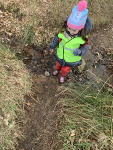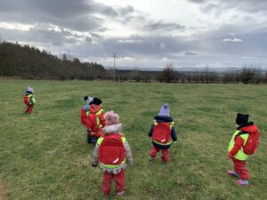 This week for ‘Woodland Wednesday’ we spent time exploring the woodland area – it was icy so the ground was hard but that meant there was ice puddles, the children enjoyed stepping on the ice to hear it crack. The children were also looking out for fallen trees and listening to the wildlife – they even found different footprints in the mud and discussed what these could be from. We also observed some spring snowdrops which was a lovely find on a cold winters day – with how cold and It was we made sure to look up into the vastness of the sky to see the trees swaying and leaves falling. On our way back to the ECC the children took part in further risky experiences where they crossed a small stream and then made their way up through the field and enjoyed the space to move and run. At the top of the field the children were presented with a challenge of climbing the gate.