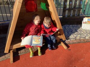 Outdoors this week the children have been revamping the outdoor area alongside Becca, utilising the new resources purchased to revamp the outdoor. We have a new shelter in the outdoor area and the children enjoyed utilising this for reading stories and exploring our new weather stones.