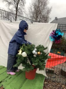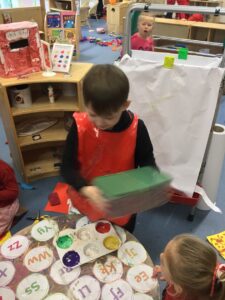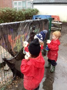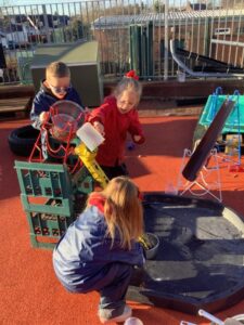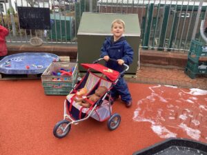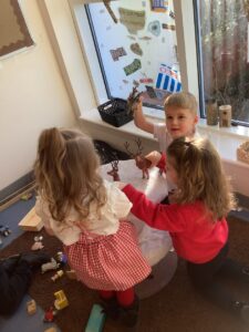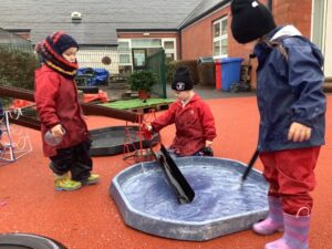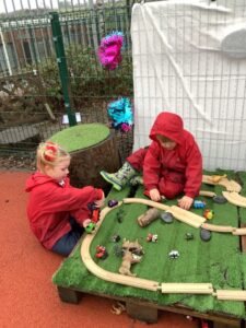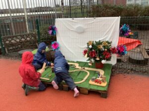 This week the children have enjoyed exploring small world space outdoors. Our theme this week was a winter wonderland after child interest in Christmas and the frost outside. The children created a train track, train station and even decorated their own outdoor Christmas tree. The children enjoyed role playing in this space and exploring the different trains we had.