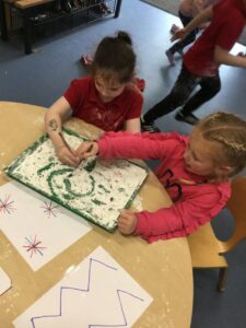 In the creative area the children have been exploring patters using a variety of Christmas shapes. The children have also been building upon their scissor control too.