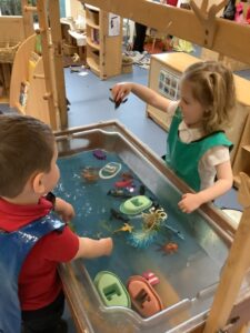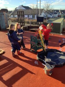 The children have also been exploring the concept of capacity and forces in the water tray. They built their very own “water slide” to see how fast the water would go and if it would fill up different sizes of pots. The children shown their ability to work in a team, helping each other build different parts of the water slides with various pipes and loose parts. The children explored capacity and were able to identify containers which were full and empty. The children were further challenged to add different heights of pipes to see how it would change the way in which the water would move. It did change the outcome with the water either moving slowly or too fast falling out of the pipe. We will continue to explore the language around capacity and forces within the water tray.