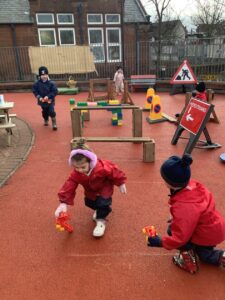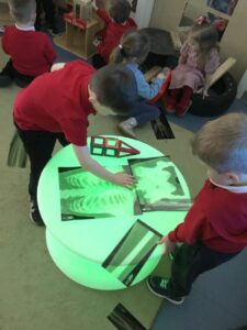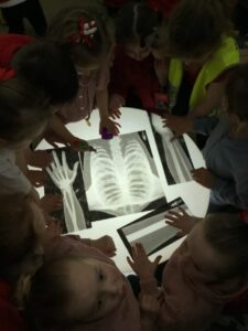 This week the children have been exploring People Who Help Us, exploring the different job roles and how their role might help us. They have enjoyed using their imaginative skills in the role play area, taking on the role of e.g. a doctor, police officer, fire fighter, applying their real life experiences to their imaginative play. All children have knowledge of People Who Help Us however, we explored the children’s learning in more depth with a focus on doctors and hospitals. Some children were able to identify body parts and the name for specific body parts, some children were exploring x-ray photographs on the light box.