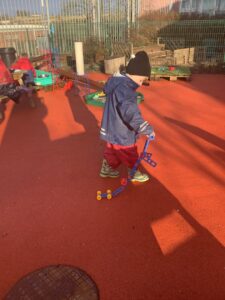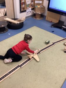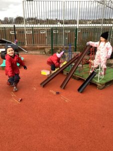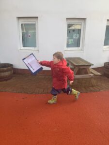 Outdoors this week we have had a focus on feelings, linking with the upcoming Mental Health Week. Whilst we had parents visiting, the children and their parents took part in a colour monster scavenger hunt, focusing on how being outdoors makes our bodies feel strong and our minds feel happy. The children have been exploring forces by creating their own vehicles and building race tracks to explore this. They also created their own data handling tally score in relation to how far something travels.