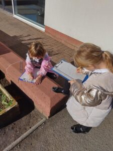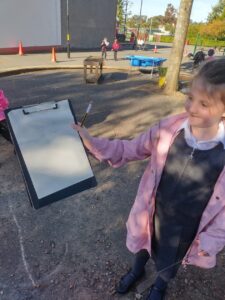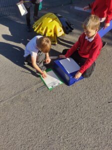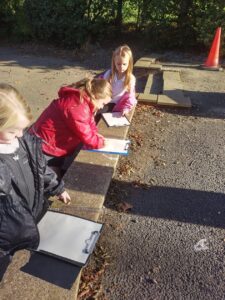 As part of our Symmetry numeracy topic, we have been learning to identify shapes which have at least one line of symmetry. We went on a scavenger hunt in the school’s playground, where we found a variety of different symmetrical shapes, including benches, drain covers, the school roof and even pine cones and traffic cones!