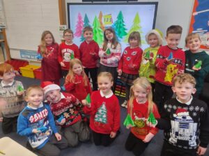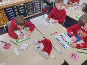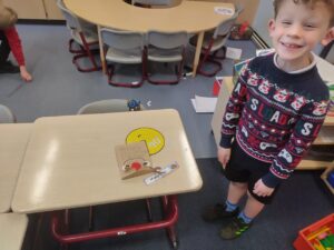 Our Christmas themed learning continued this week, as we used our knowledge of symmetry and shape to create a 3D Christmas Tree. We began with using our rulers and scissors to measure and cut a 20cm 2D square shape, which we then folded to create 4 lines of symmetry. Further triangular folds created the Christmas Tree shape. We finished off by making small cuts along the length of our shape to create the branches. We opened up the final shape, folding small triangles at the edge of the branches, allowing our tree to stand unaided in 3D form. A great way to showcase our growing skills and confidence in model building!