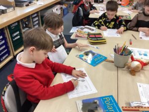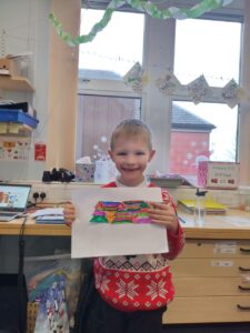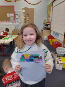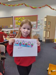 As Christmas draws nearer, we explored a winter village scene, complete with Christmas Tree, as part of our learning in expressive arts. We used our skills in line and shape drawing to recreate a classic image including snow covered roofs and hills, a forest and an imposing church to set us in the festive mood. We finished off our art with lots of colours, contrasting icy blues with lush greens.
