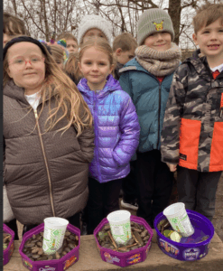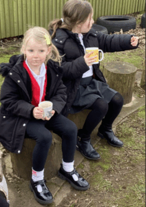 When the weather was chilly last week, we thought we would try some Science outdoors and explore changing a liquid into a solid by making some ice lanterns. Unfortunately our lanterns didn’t freeze all the way through to allow us to take them out of the containers but we did have a great time outside. We managed to change a solid (marshmallows) into a semi sticky yummy solid by dipping the solid in a warm liquid (hot chocolate) !
