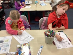 To develop our sentence writing skills, P2 played a sentence building game, rolling the dice to select the who, what and where for each sentence. This led to some hilarious combinations. They combined this with our learning in adjectives, to help bring our sentences to life!