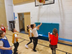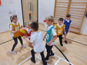 Our basketball skills have really developed over the last few weeks. We combined all the skills we have been learning to take part in a 5-a-side mini tournament. Some excellent teamwork, passing, dribbling and shooting was on display. Each team won a match, and well done to the Green team, who finished with two victories!