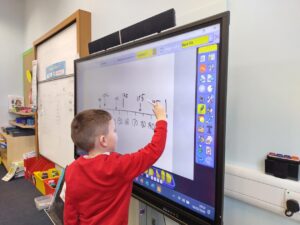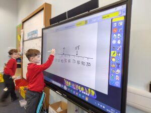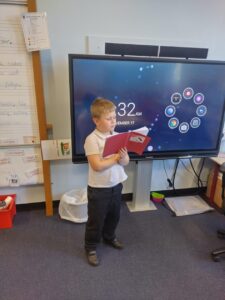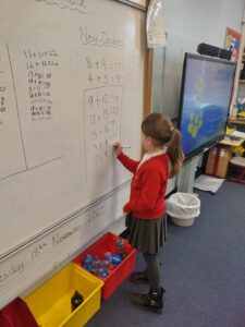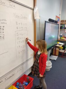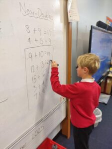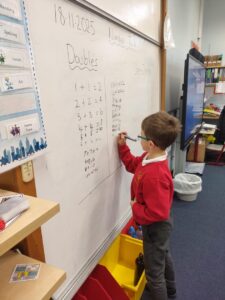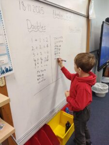 In our Number Talk today, we focused on doubles, where we worked up to double 20. We recognised that when we use doubles, we are following the 2 times table. We used this knowledge to then extend our learning into near-doubles, where we learnt that to solve tricky sums, we can use our nearest double to help us work towards the answer. Pupils enjoyed ‘being teacher’ and sharing their answers on the class whiteboard.