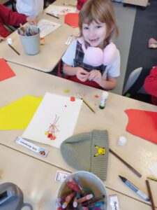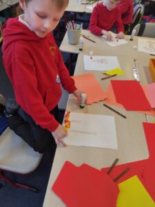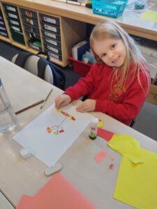 Our creative arts this week has an Autumn into Winter theme. We noticed from our classroom windows that the trees are starting to lose all their leaves. We are creating a 3D collage, using coloured card to represent the leaves, with a few still on the branches, and the rest lying on the ground. The class enjoyed hanging their pictures once complete.