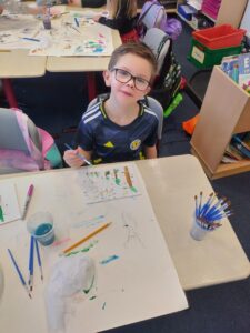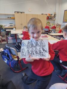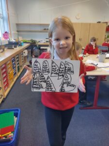 As Christmas draws nearer, we explored a winter village scene, complete with Christmas Tree, as part of our learning in expressive arts. We used our skills in line and shape drawing to recreate a classic image including snow covered roofs and hills, a forest and an imposing church to set us in the festive mood. We finished off our art with lots of colours, contrasting icy blues with lush greens.