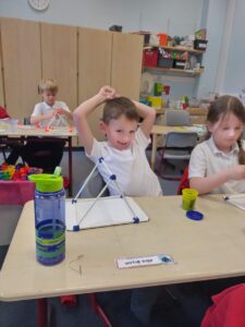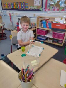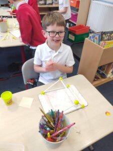 In our Shape lesson today, we discovered a new shape – the triangular prism. We learned that it is created from both rectangles and triangles, and is a 3D shape with 9 edges, 5 faces, and 6 vertices. We then built our own models, using straws and Play-Doh. Everyone in class achieved all 5 of our success criteria, which the class agreed on beforehand.