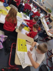 To develop our sentence writing skills, P2 played a sentence building game, rolling the dice to select the who, what and where for each sentence. This led to some hilarious combinations. They combined this with our learning in adjectives, to help bring our sentences to life!