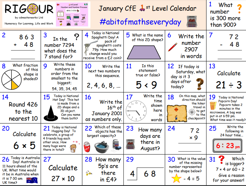 Continue working through the November maths calendar. Remember, we have not yet re-visited all topics in numeracy so there may be some questions that you need support with.
