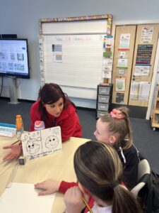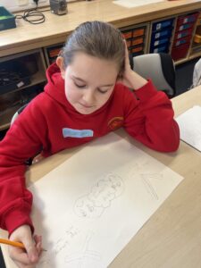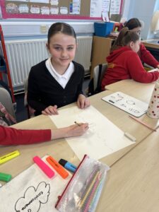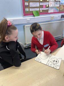 Today we had our first session on  learning about becoming Well-being Champions for the school, we enjoyed listening to the meeting and taking part in some activities. Here we are doing some Yoga as a brain break and creating t-shirt designs about emotions.
