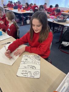 This week we have been learning about Japanese Culture and Writing. We learned about Samuri Warriors, Mrs Scarisbrick brought in a wooden Katana for us to see. Taymiyah got dressed in a Kimono and we looked at a hand painted wooden and paper fan.