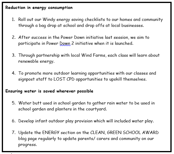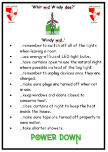 Our class ‘Whit Wid Windy Dae?’ checklists were adapted and sent home to ‘oldest and only’ so that every household had one, thus ensuring that all pupils were leading the changes of behaviours regarding energy, in their homes. In addition to this, they were adapted for use local businesses and distributed throughout the village, ensuring the same message regarding energy saving was shared throughout the community.