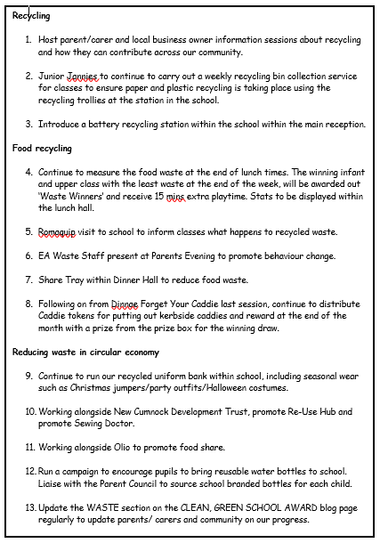 Our Junior Jannies continue to take a leadership role in ensuring each room in our school (extending beyond the classrooms to the staff room, office and SLT offices) is equipped with the bins to recycle waste. When required, they have spoken to classes about contamination within these bins to ensure waste is recycled correctly. They work alongside the school Janitor to carry this duty out on a weekly basis. They have since visited local shops and businesses, to share the same message about recycling waste. They have checked they have different bins for their paper, plastic and general waste and are sorting these appropriately, even providing boxes to do so if they didn’t have one at hand. They felt very official on their visits as they had their ID badges on.