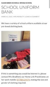 Our school uniform bank continues to run all session and is available to our families at the Community Entrance daily. At school events (discos, fundraisers, concerts) this table is highlighted to encourage people to take what they need. It is well organised and clearly labelled for ease of looking. Seasonal wear continues to be shared at key points through the year and is made available at Parents Evenings and events where the parent body are invited in, as appropriate throughout the session. In addition to this, we have shared our Home Link Practitioners work mobile number on our school communications, asking families to reach out in private, should they be seeking clothing in a certain size and Mrs Bradford will gather and deliver where necessary.