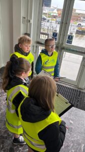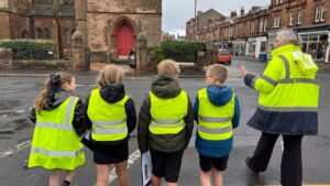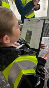 After being on the stage, it was time to go outside with Fiona who is one of the staff members from Ayrshire Roads Alliance. We had to wear a Hi-Viz vest and we were given a clipboard with road signs and pictures. We went out and discussed all the signs we could see as well as looking at various places that would be safe to cross. We looked at junctions as well as the lines painted on the road and the importance of them.