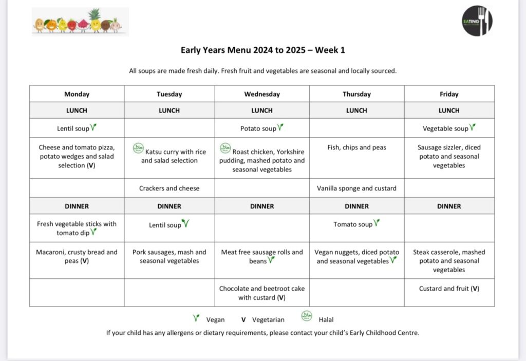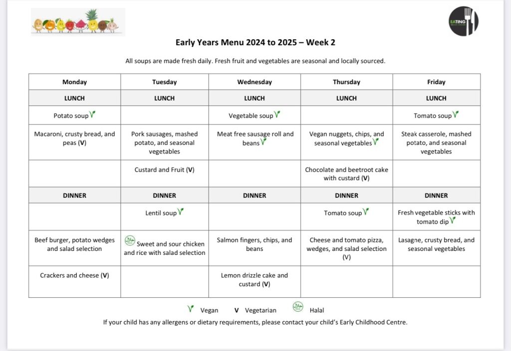 Every Child accessing 1140 hours are entitled to a free meal. Depending on their allocated sessions. This will either be lunch or high tea. Please find the menus and allergen matrix below.